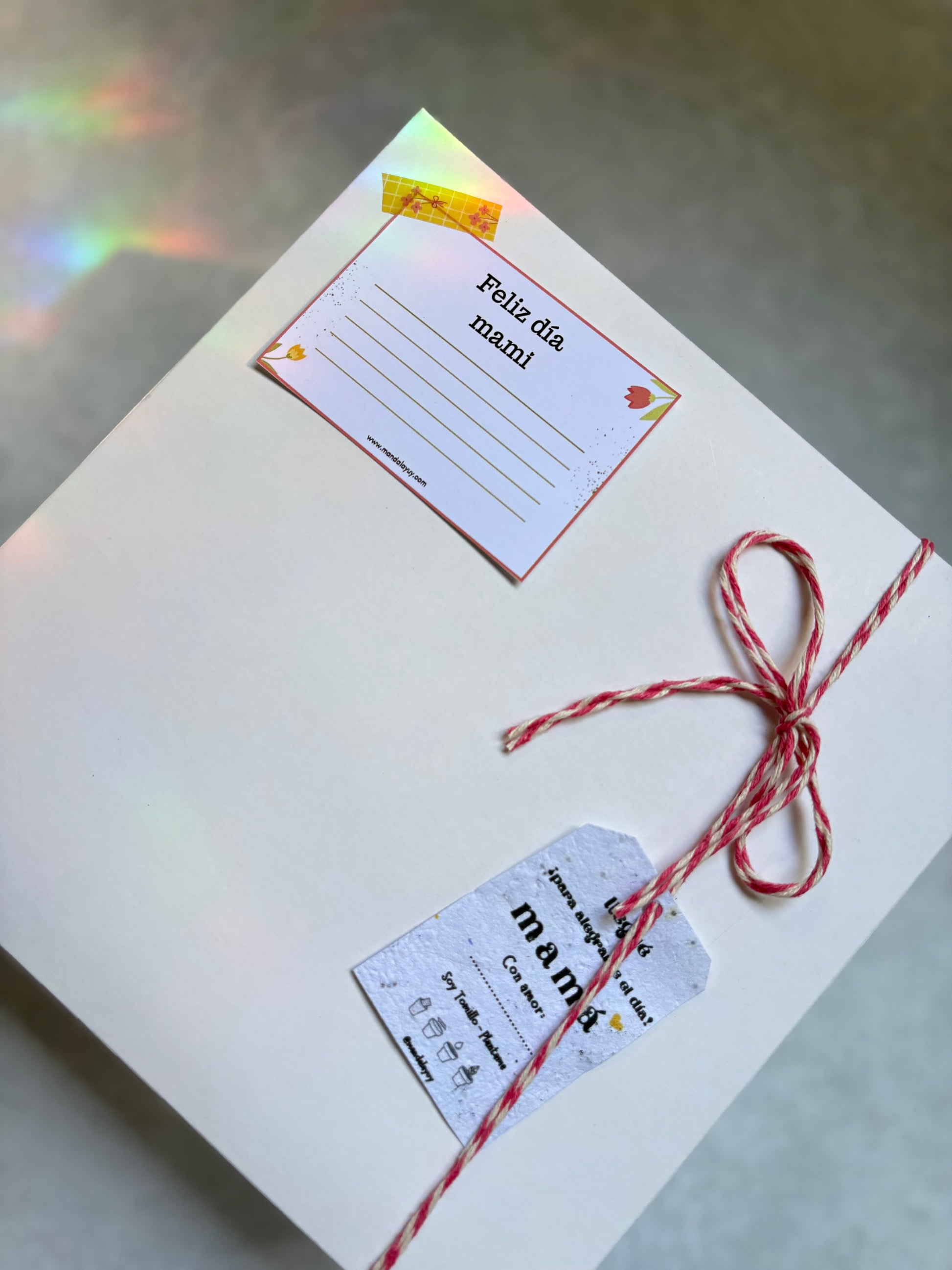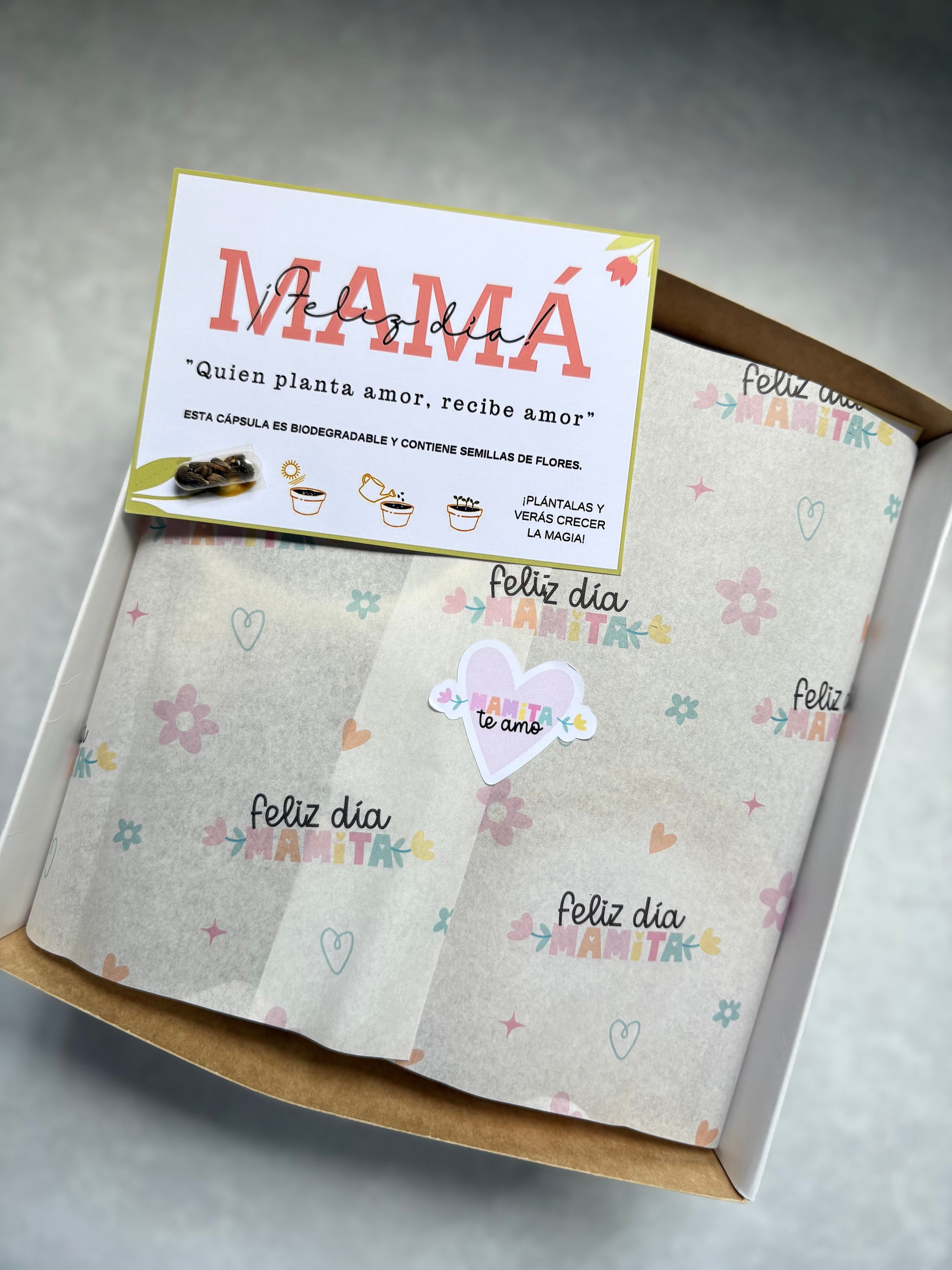 tarjeta feliz día con una capsulita biodegradable con semillitas para plantar y las cajitas se cierran con hilo y tarjetita de papel reciclado plantable🥰